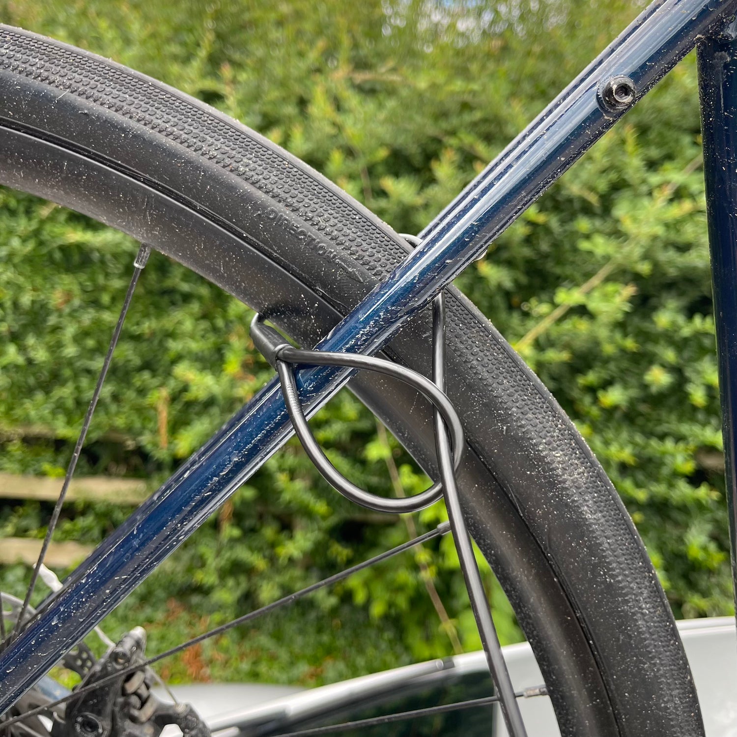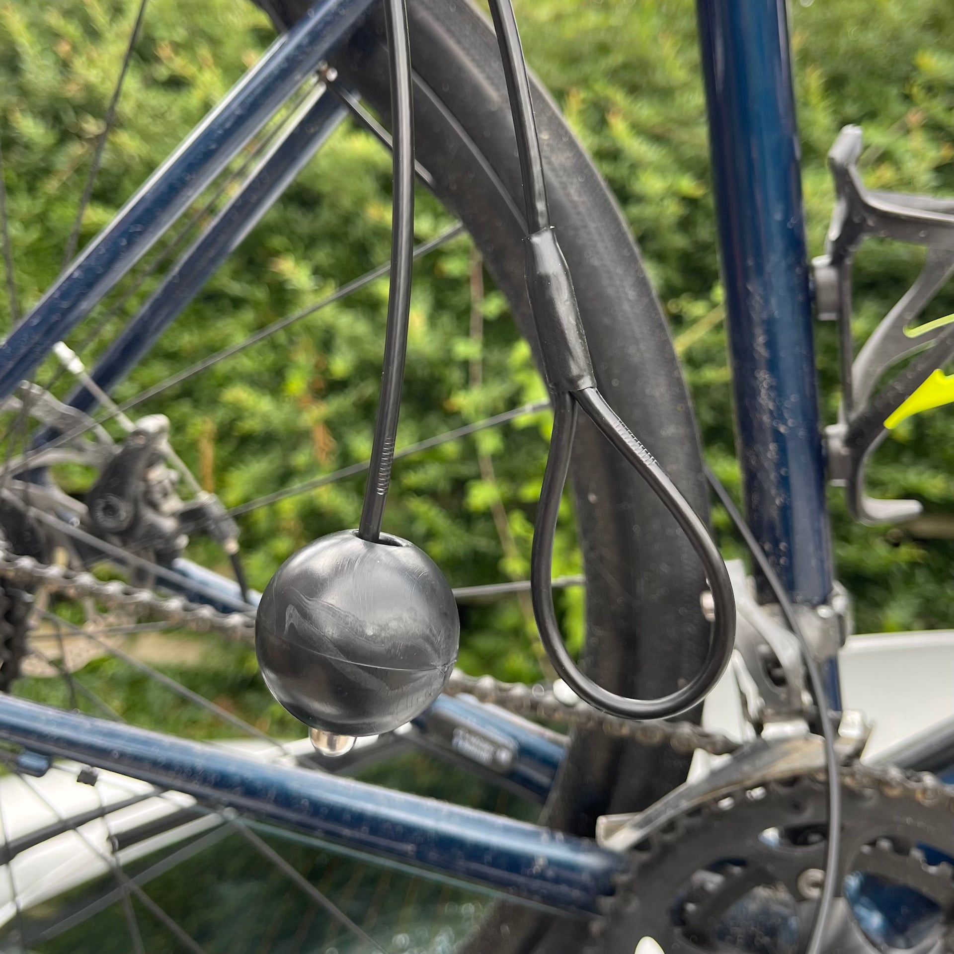 Faites une boucle autour de votre équipement/porte-bagages – Prenez le dispositif antivol par l’extrémité avec la boucle, placez-le dans la roue ou le cadre de votre vélo ou faites une boucle autour du bras supérieur de votre porte-bagages Piste/Tidal. Prenez maintenant votre butée à bille et faites-la passer dans la boucle. Tirez jusqu’à ce que le câble soit fermement enroulé autour de votre équipement.